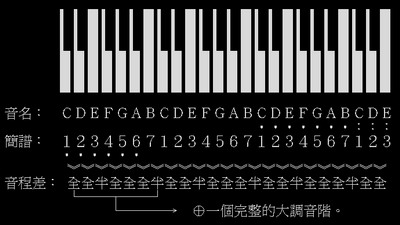 半音等於一個「全音」。舉例來說,C與D兩個白鍵之間夾一個黑鍵,