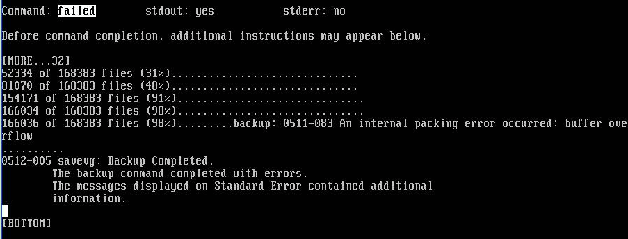 166036 of 168383 files (98%).........backup: 0511-083 An internal packing error occurred: buffer overflow