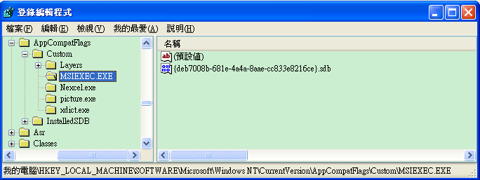 HKLM\Software\Microsoft\WindowsNT\CurrentVersion\AppCompatFlags\Custom\MSIEXEC
