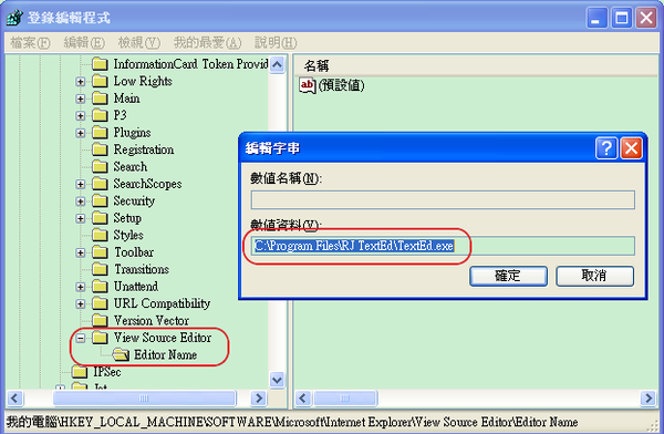 「HKEY_LOCAL_MACHINE > SOFTWARE > Microsoft > Internet Explorer > View Source EditorEditor > Editor Name」